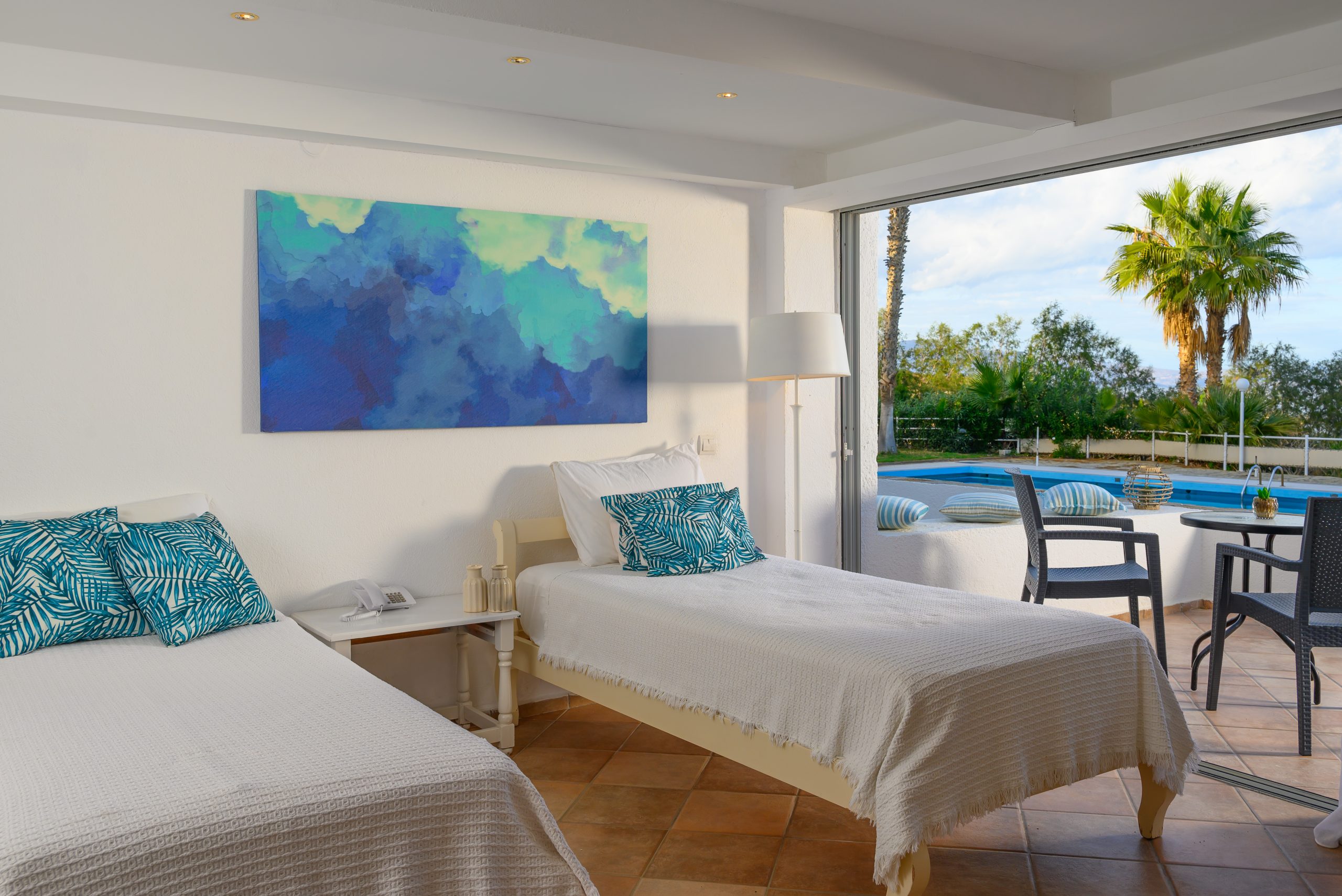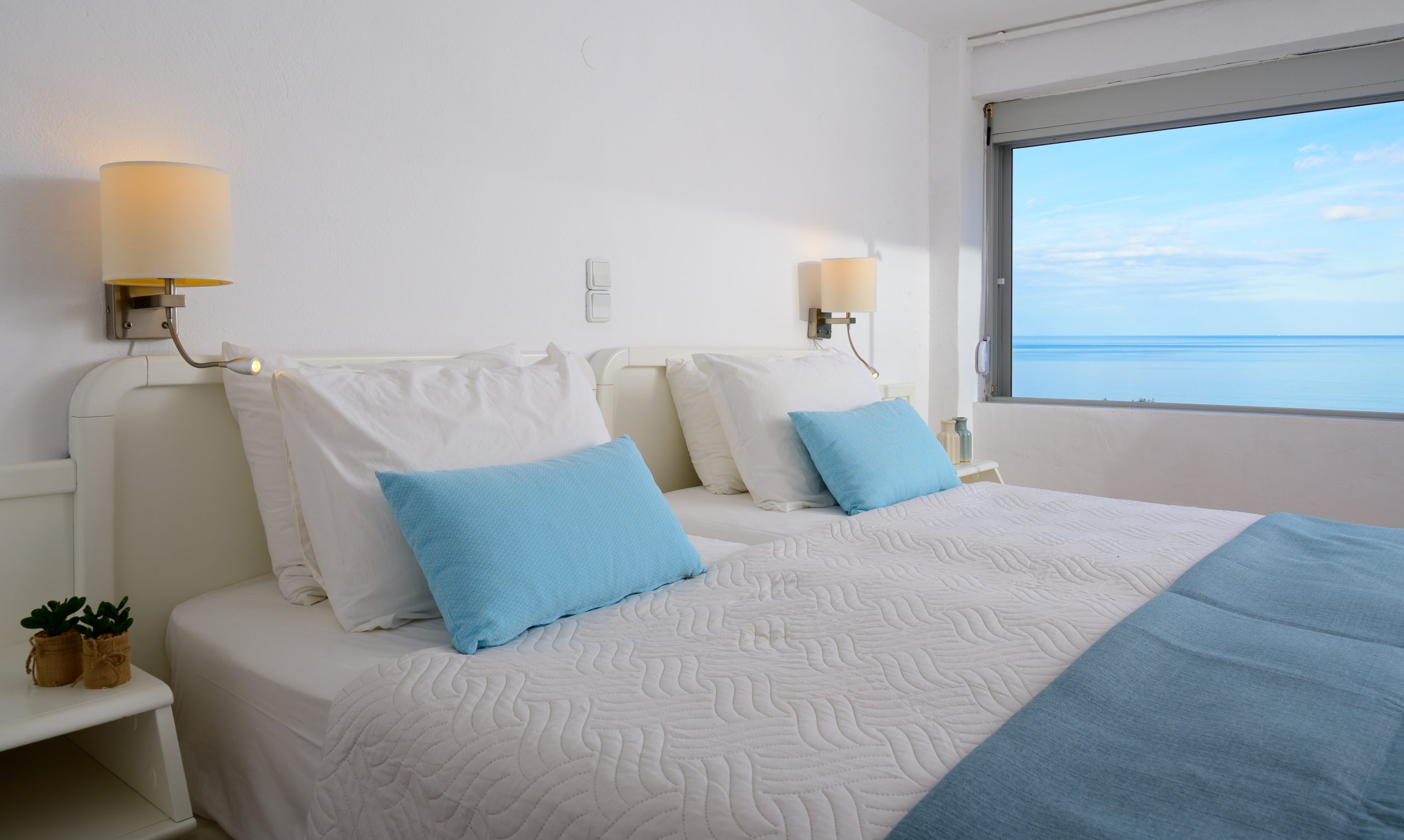 Step out from your Bedroom to your private covered spacious terrace and admire the views over the Mirabello Bay The private patio has a table and chairs so you can admire the view Featuring of one double bed or two twin beds and a sitting area with a sofa. en suite bathroom and many room amenities.This accommodation can host up to 4 Adults or 2 Adults and 2 Children.