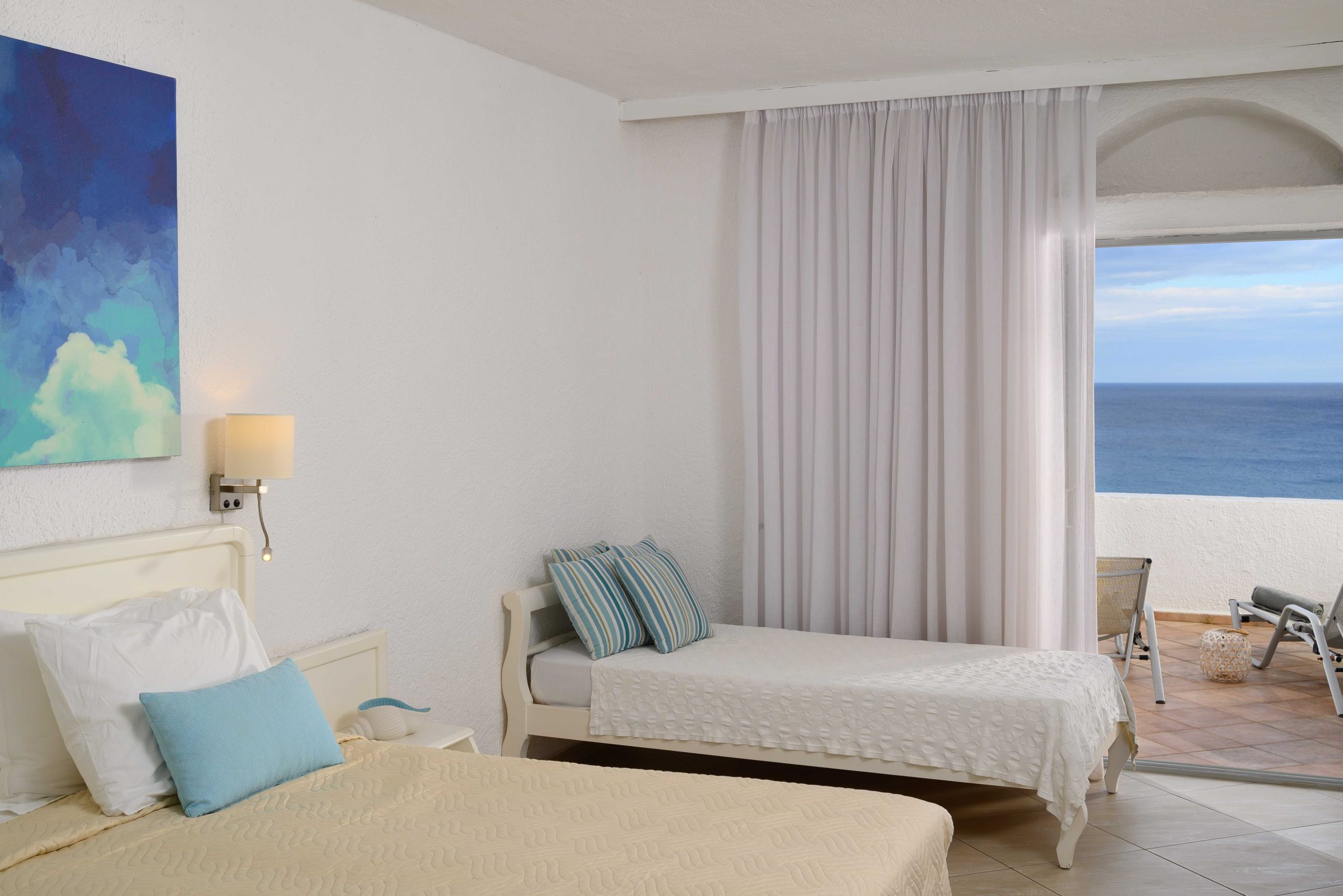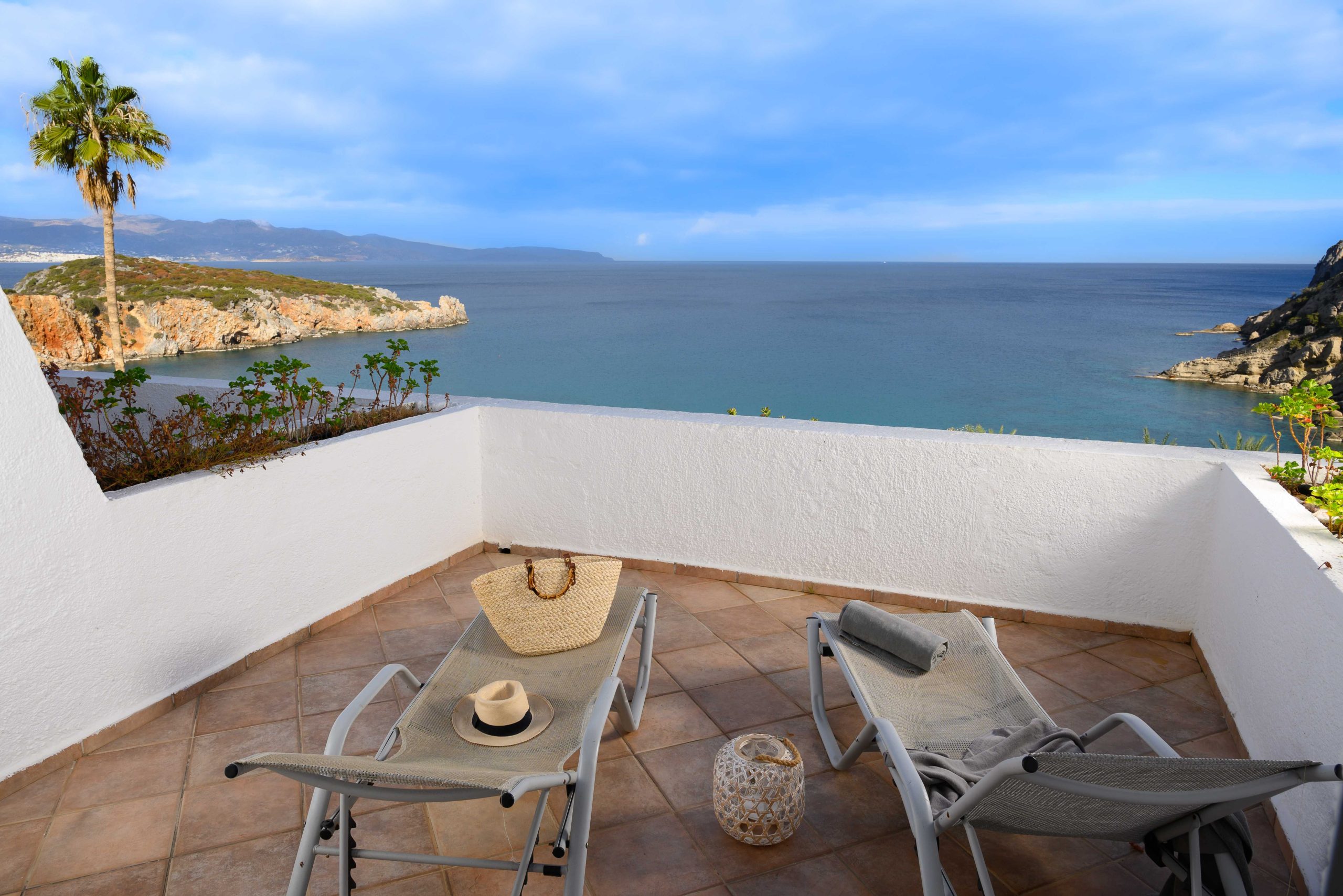 Step out from your Bedroom to your private covered spacious terrace and admire the views over the Mirabello Bay The private patio has a table and chairs so you can admire the view Featuring of one double bed or two twin beds and a sitting area with a sofa. en suite bathroom and many room amenities. This accommodation can host up to 4 Adults or 3 Adults and 1 Child or 2 Adults and 2 Children.